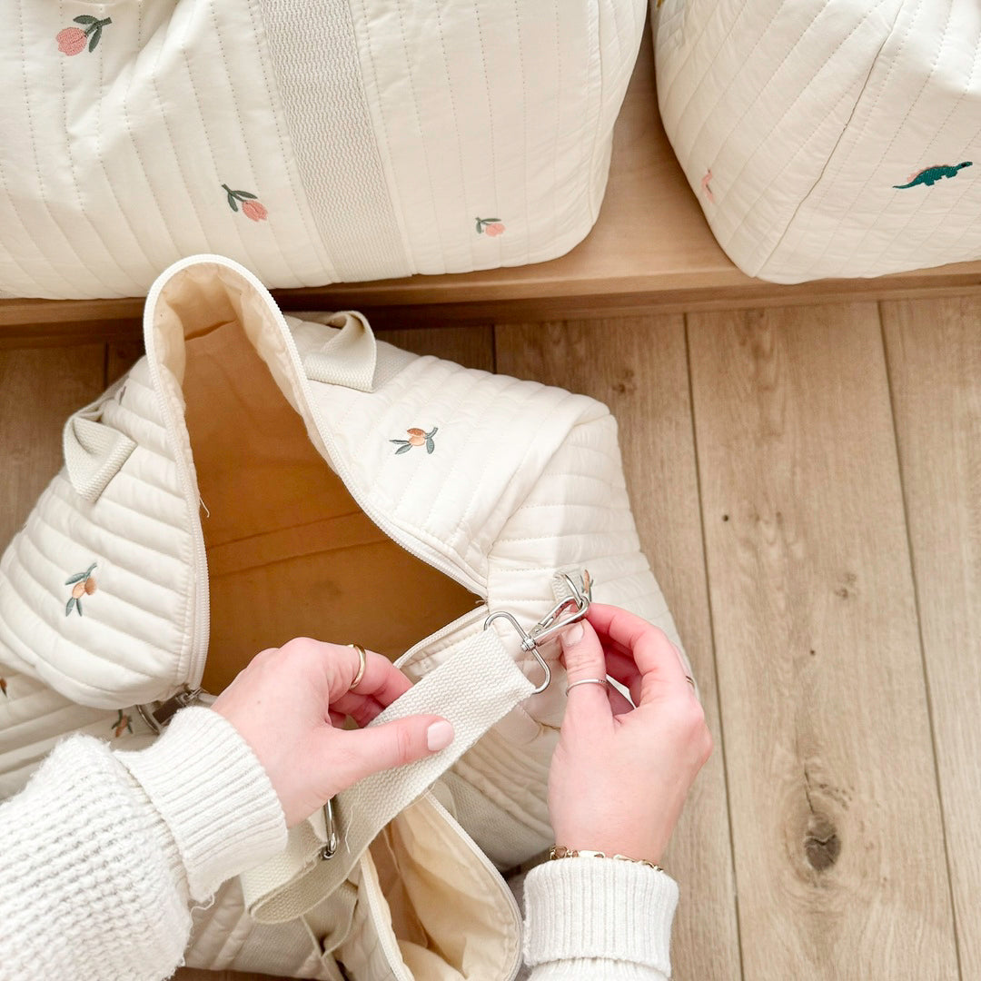 Crafted for both durability and elegance, this bag features vertical quilting stitches for extra strength and a timeless, chic look. The removable sling strap allows for hands-free carrying, while its lightweight build ensures comfort on the go. Whether worn over the shoulder or attached to a stroller, this bag is your perfect travel companion.